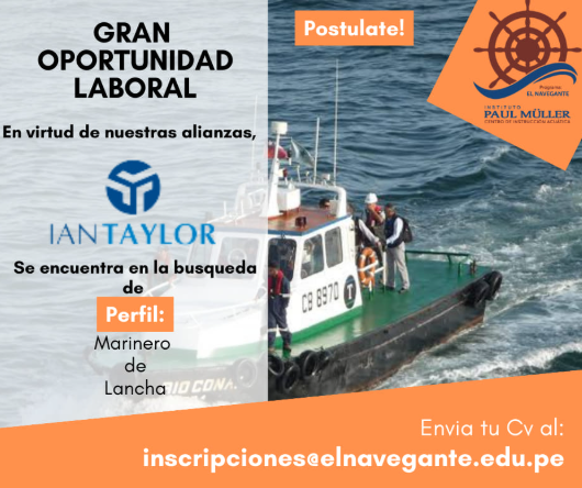 𝗔𝗧𝗘𝗡𝗖𝗜𝗢́𝗡 𝗚𝗘𝗡𝗧𝗘 𝗗𝗘 𝗠𝗔𝗥 En virtud de nuestras alianzas Nuestra institución hace un llamado a todos aquellos interesados Y en convocatoria con la EMPRESA IAN TAYLOR [EMPRESAS TAYLOR], la cual se encuentra en la búsqueda del siguiente perfil, a fin puedan ser considerados miembros de su flota El perfil: Marinero de Lancha: – Experiencia en […]